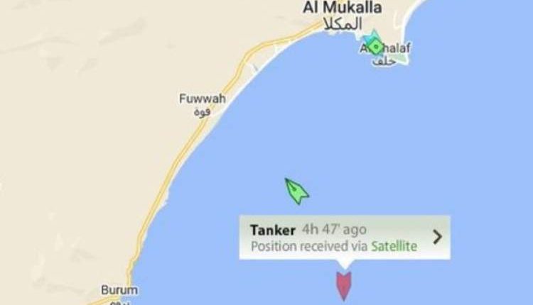 وقال الصحفي وحيد الطوالبة في تدوينة على (تويتر): ” منذ خمسة أيام والسفينة تقف على بعد 12 ميلاً من ميناء المكلا والمعلومات تقول انها سفينة نقل نفط عملاقة يتم نقل النفط لها من خلال سفينتي شحن عاديتين من الميناء وحتى تتم التعبئة ستغادر”.