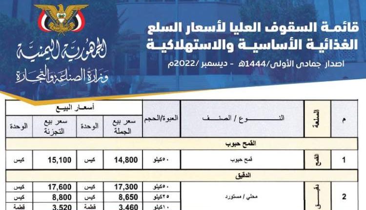أعلنت وزارة الصناعة والتجارة  في حكومة صنعاء عن لائحة سعرية مخفضة للمواد الغذائية الأساسية .