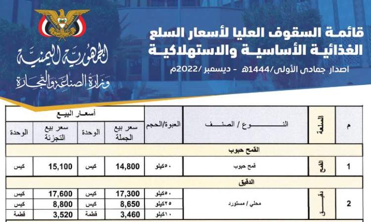 وحددت سعر القمح الحبوب 50 كيلو جراماً  بمبلغ 14800ريال للجملة و و15100 ريال للتجزئة , كما حددت سعر كيس الدقيق 50 كيلو جراماً بمبلغ 17300 ريال للجملة و مبلغ 17600 للتجزئة .