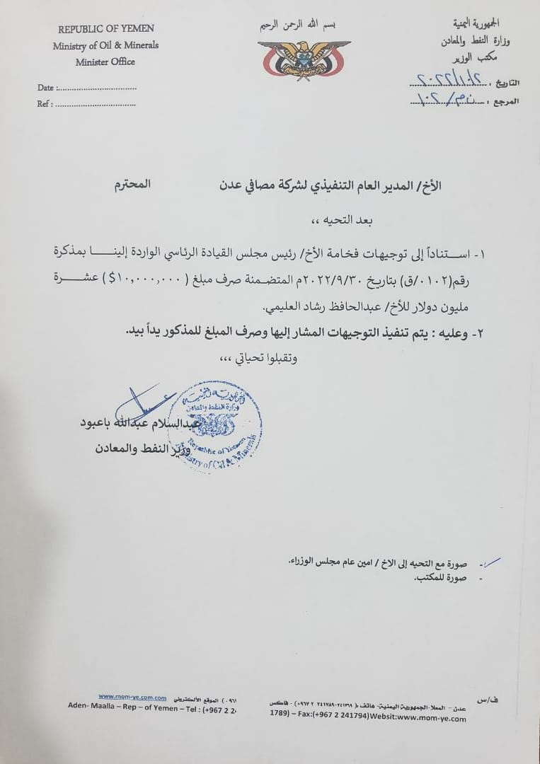 وفي المذكرة الموجهة من باعبود إلى المدير التنفيذي لشركة مصافي عدن مطلع شهر أكتوبر الماضي بصرف 10 ملايين دولار لعبدالحافظ رشاد العليمي والتي أوضح خلالها أنها استنادا إلى توجيهات رئيس مجلس القيادة الرئاسي.
