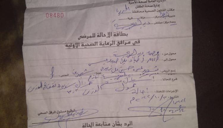 بعد عدّة أَيَّـام من استقبال الطفلة في المستشفى، لاحظ الفريق الطبي ظهور عارض جديد لدى الطفلة، مختلف عن الحالة التي تم استقبالها؛ بسَببِها في المستشفى. وبما أن علاج هذه الحالة غير متوفّر في مستشفى عبس، وهو خارج معايير الإحالة المحدّدة من قبل منظمة أطباء بلا حدود، كما هو خارج معايير الإحالة التابعة لوزارة الصحّة، فقد نُصح الأهل باستشارة طبيب مختصّ بهذه الحالة في مستشفى آخر.