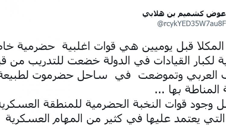 وأشار كشميم في سلسلة تغريدات على صفحته الرسمية بمواقع التواصل الاجتماعي إلى أن استدعاء قوات من الساحل الغربي التي يقودها طارق صالح يأتي في إطار ترتيبات لنقل 3 الوية من قوات النخبة الحضرمية إلى الساحل الغربي في إشارة إلى محاولة التحالف تقليص نفوذ الفصائل المحسوبة على الانتقالي ..