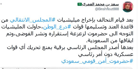 وأفاد الكاتب السعودي سعد العمري بأن الانتقالي كان يحاول الرد على انتزاع قاعدة العند منه بتفجير الوضع في حضرموت لكن اصدار رشاد العليمي توجيهات من مقر اقامته بالعاصمة السعودية تقضي بمنع أي تحركات اجهض خطط الانتقالي.