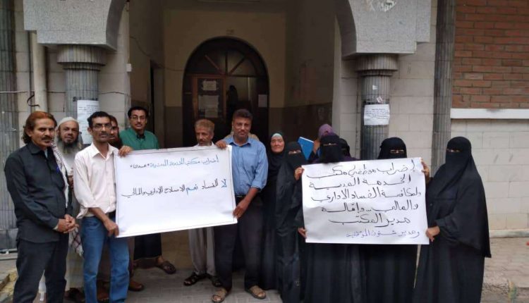 ونفذ موظفو وزارة الخدمة المدنية في حكومة معين، والتي يتولاها القيادي في الانتقالي، عبدالناصر الوالي، وقفة احتجاجية للمطالبة بتحسين وضعهم المعيشي.