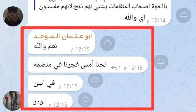 ونشر الخبير في شؤون الجماعات المتطرفة محمد بن فيصل، المحسوب على الانتقالي، نص مراسلات بين  عناصر  ما تعرف بـ”مناصرين  ولاية اليمن”، وهي مجموعة خاصة بجنود التنظيم في اليمن ولا يمكن الدخول اليها الا بتوصية من قيادات التنظيم..