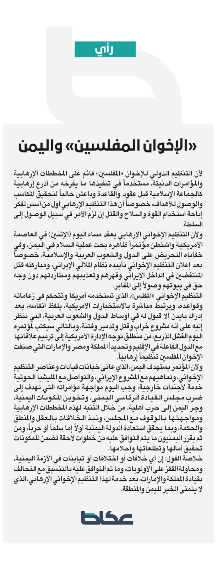 وافردت صحيفة عكاظ مقالا افتتاحي تحت عنوان ” الاخوان المفلسين واليمن”..