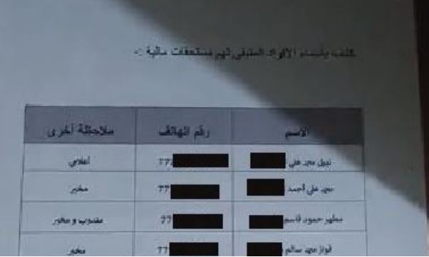 وأشارت الوثائق إلى أن “الأشخاص المجندين الذين نشرت أسمائهم وأرقام هواتفهم المحمولة هم: محمد علي أحمد، مطهر حمود قاسم، فواز محمد سالم، إبراهيم سيف، نبيل عبدالجليل، فؤاد عبدالوهاب محمد، فايز علي محمد”.