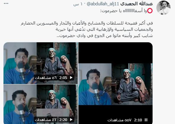 وأفاد  ناشطون حضارم  على مواقع التواصل الاجتماعي بأن العجوز اغلق على نفسه باب بيته وبجواره طفلته  بانتظار الموت بعد أن تقطعت  بهم السبل، مشيرين إلى أن جيران العجوز استدعوا الشرطة لاقتحام منزله في ضواحي المكلا ليجدوه   بوضع  جلوس  يتضرع إلى الله وبجواره طفلته  وقد فارقا الحياة تماما..