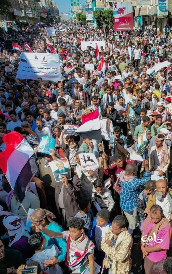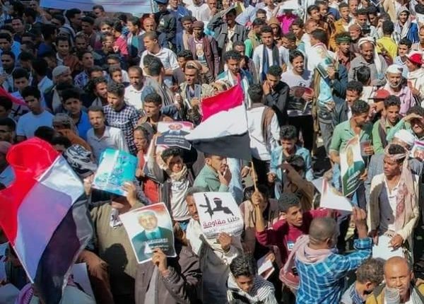 وشارك الالاف من اتباع المخلافي وتوكل بتظاهرة وسط مدينة تعز، رفعوا خلالها صور “المقاومة الشعبية” وحمود المخلافي ..