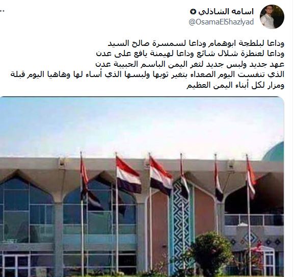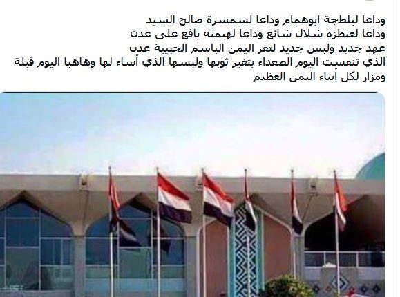 وتداول ناشطون على مواقع التواصل الاجتماعي صورة لأعلام الجمهورية اليمنية ترفرف على المطار وامامه..