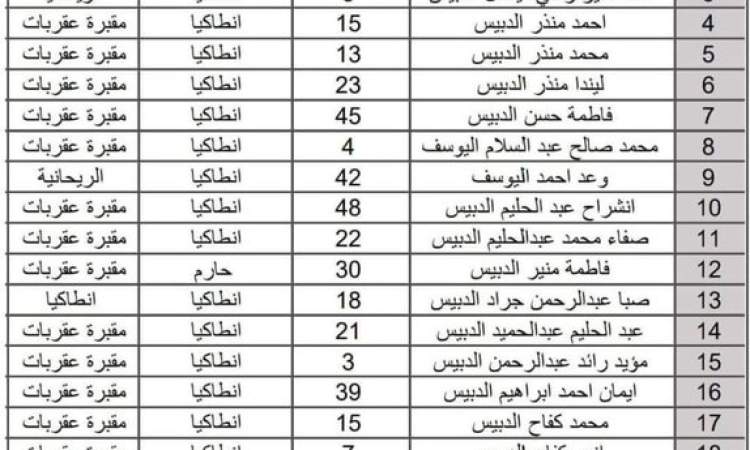 ونشر مراسل قناة العربية ردفان الدبيس أسماء 21 فردا بينهم أطفال ونساء قالوا انهم لقو حتفهم في الزلزال الذي ضرب مدينة انطاكيا وتم دفنهم هناك.