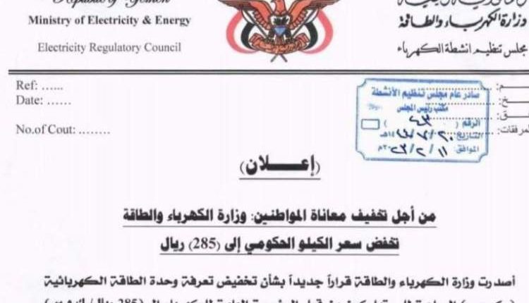 أعلنت وزارة الكهرباء والطاقة في صنعاء عن خفض جديد بأسعار تعرفة الطاقة الكهربائية للمواطنين .
