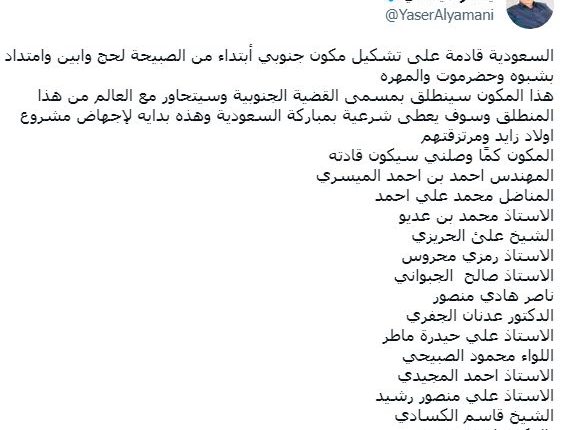 وأفاد ياسر اليماني في منشور على صفحته بمواقع التواصل الاجتماعي بأن السعودية تسعى لتشكيل تحالف جنوبي يضم قيادات من الصبيحة في لحج وابين امتدادا إلى المهرة وشبوة وحضرموت..