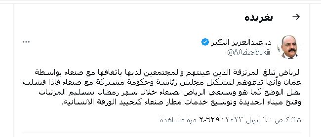 وقال وزير الدولة في حكومة صنعاء عبدالعزيز البكير في تدوينة على (تويتر): “الرياض تبلغ المرتزقة الذين عينتهم والمجتمعين لديها باتفاقها مع صنعاء بواسطة عُمان وأنها تدعوهم لتشكيل مجلس رئاسة وحكومة مشتركة مع صنعاء “.