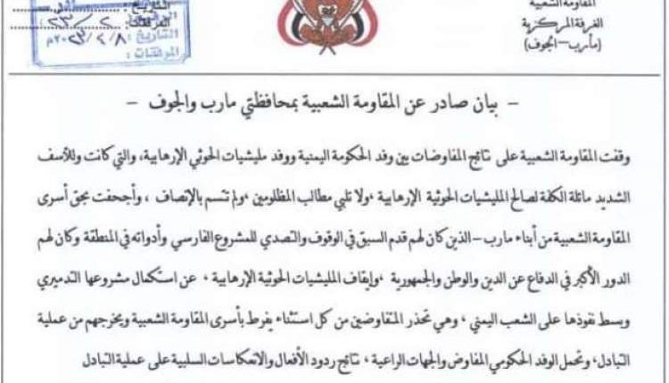 واصدر حزب الإصلاح بيانا باسم المقاومة الشعبية في مأرب والجوف ، قال فيه انه تم اقصاء أبناء مأرب من صفقة تبادل الاسرى .