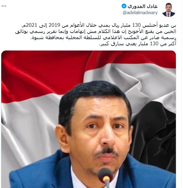 وقال الصحفي في الانتقالي عادل المدوري بان وثائق رسمة أظهرت استحواذ بن عديو على نحو 130 مليار ريال خلال الفترة من 2019- 2021.