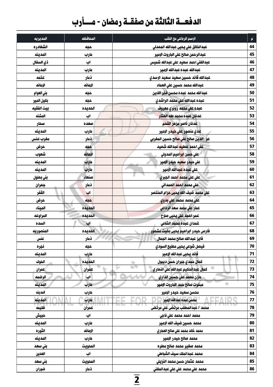 أعلن ‏رئيس لجنة شؤون الأسرى في حكومة صنعاء، عبدالقادر المرتضى، السبت، عن قائمة بأسماء الدفعة الثالثة من الأسرى والمعتقلين، الذين سيتم الإفراج عنهم ضمن “صفقة رمضان”.