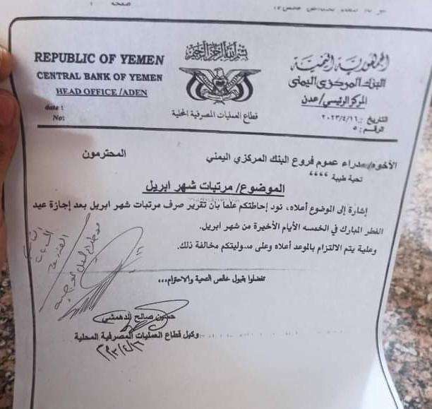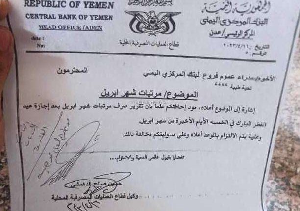 وأصدر وكيل قطاع العمليات المصرفية بالبنك المركزي في عدن، حسين الدهمشي، مذكرة لمدراء فروع البنك المركزي، تقضي بوقف صرف مرتبات شهر أبريل قبيل إجازة عيد الفطر المبارك، وتأجيل الصرف إلى ما بعد إجازة العيد.