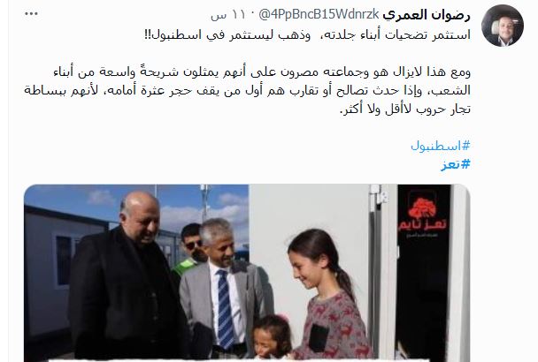 وبينهم اتهم ناشطون المخلافي باستثمار معانة اليمنيين لحماية مصالحه في تركيا، استعرض اخرين الحالة التي وصل اليها جرحى فصائله واسر قتلاه الذين جرهم خلال سنوات الحرب الاولى إلى محارق الموت بتعز.