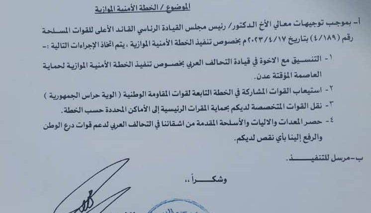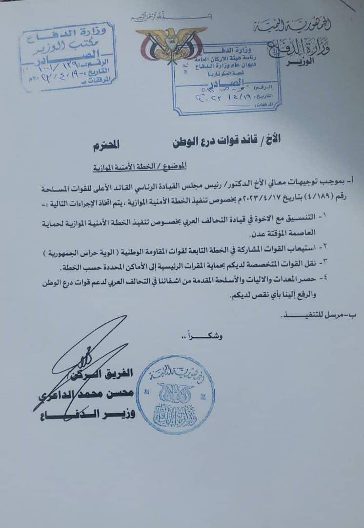 وأظهرت وثيقة مسربة موجهة من وزير الدفاع في حكومة معين ، محسن الداعري إلى قوات درع الوطن ، صدور توجيهات من رئيس مجلس القيادة المشكل من السعودية رشاد العليمي في تاريخ 12 ابريل بـ ” تنفيذ خطة موازية لحماية عدن ” تتضمن استيعاب قوات طارق صالح للمشاركة في الخطة .