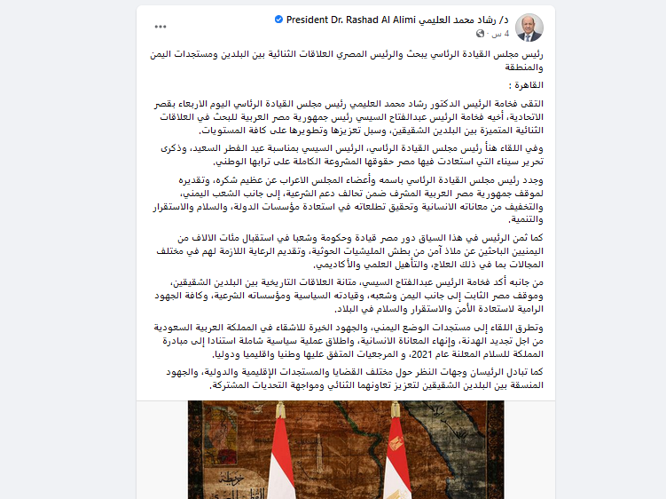 وأوردت وسائل الإعلام المصرية تأكيد السيسي على دعم وحدة اليمن وسيادته وجهود الحل السياسي، غير ان رشاد العليمي الذي نشر خبر لقائه مع السيسي في صفحته على فيسبوك شطب فقرة دعم الرئيس المصري للوحدة اليمنية.