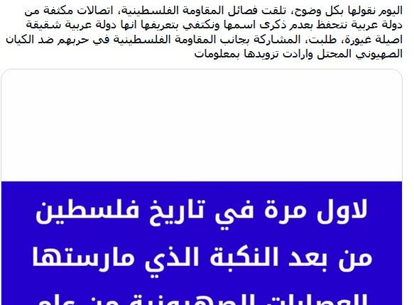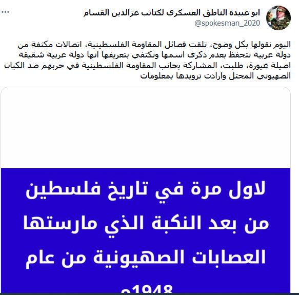 وكتب ابو عبيدة الناطق العسكري لكتائب عز الدين القسام منشور على صفحته بمواقع التواصل الاجتماعي قال فيه: “اليوم نقولها بكل وضوح تلقت المقاومة الفلسطينية اتصالات مكثفة من دول عربية طلبت المشاركة بجانب المقاومة الفلسطينية في حربها ضد الكيان الصهيوني المحتل ، مشيرا إلى طلبها تزويدها بمعلومات.