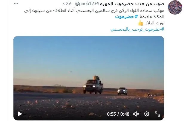 وتداول ناشطين على مواقع التواصل الاجتماعي مقطع فيديو لموكب يضم عشرات الاطقم والمدرعات قادمة من سيئون التي وصل اليها البحسني في وقت سابق صباح اليوم قادما من القاهرة.