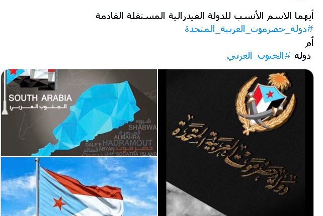 وقال مستشار الرئيس الإماراتي عبدالخالق عبدالله في تدوينة على (تويتر) : ” أيهما الاسم الأنسب للدولة الفيدرالية المستقلة القادمة دولة حضرموت العربية المتحدة أم دولة الجنوب العربي “.