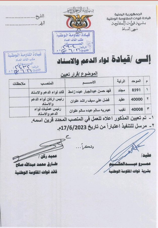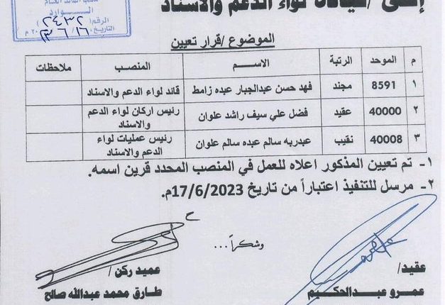 وأكد أن طارق أطاح بقائد “لواء التدخل السريع” أبو ذياب العلقمي من أبناء الصبيحة وتعيين المجند “فهد حسن عبد الجبار عبده زامط” قائدا للواء، وفق وثيقة قرار التعيين الصادرة بتاريخ أمس الجمعة 17 يونيو الجاري.