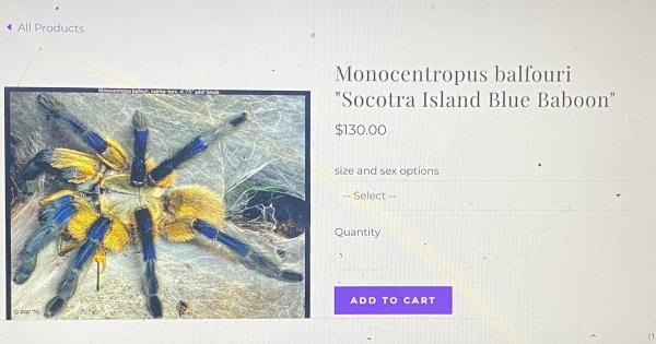 ونشر موقع tarantulaspiders الأمريكي إعلاناً يعرض فيه بيع عنكبوت سقطرى البابون الأزرق Monocentropus balfouri نوع “الرتيلاء” بسعر 130.00 دولار.