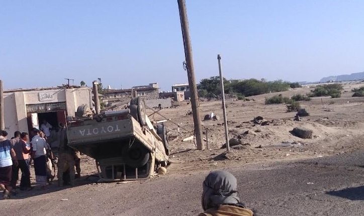 وقالت مصادر محلية إن آلية عسكرية للحزام الأمني التابع لقوات الإنتقالي الموالية للإمارات، انقلبت في خط البريقة بسبب السرعة الجنونية، مؤكدة أن انقلاب الآلية أدى لإصابة 2 مواطنين في منطقة الحادث.