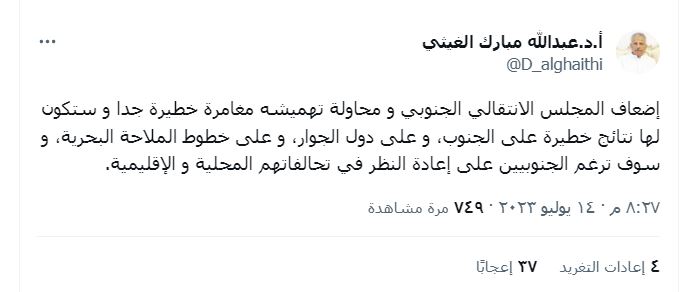 وقال القيادي في الانتقالي بحضرموت عبدالله مبارك الغيثي في تدوينة على ( تويتر ): ” إضعاف المجلس الانتقالي الجنوبي ومحاولة تهميشه مغامرة خطيرة جدا وستكون لها نتائج خطيرة على الجنوب ، وعلى دول الجوار “.