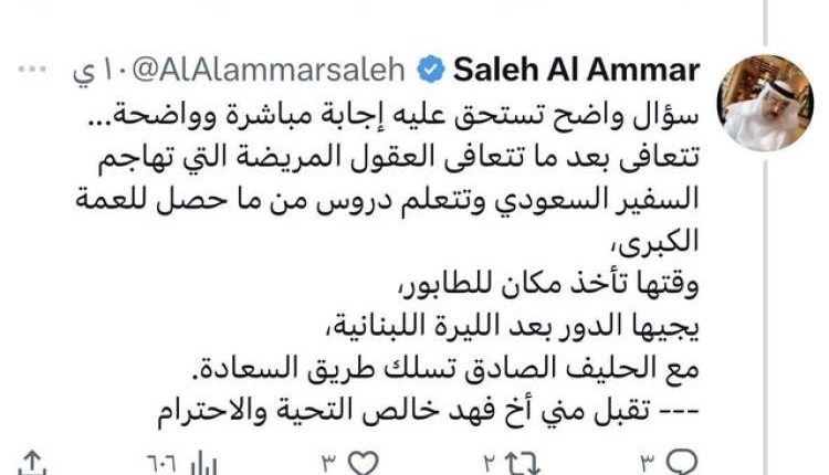 وقال الخبير الاقتصادي صالح العمار في منشور على صفحته الرسمية بمواقع التواصل الاجتماعي بأن وقف انهيار العملة مرهون بتعافي ما وصفها بـ”العقول الجنوبية المريضة” وتوقفها عن مهاجمة السفير آل جابر.