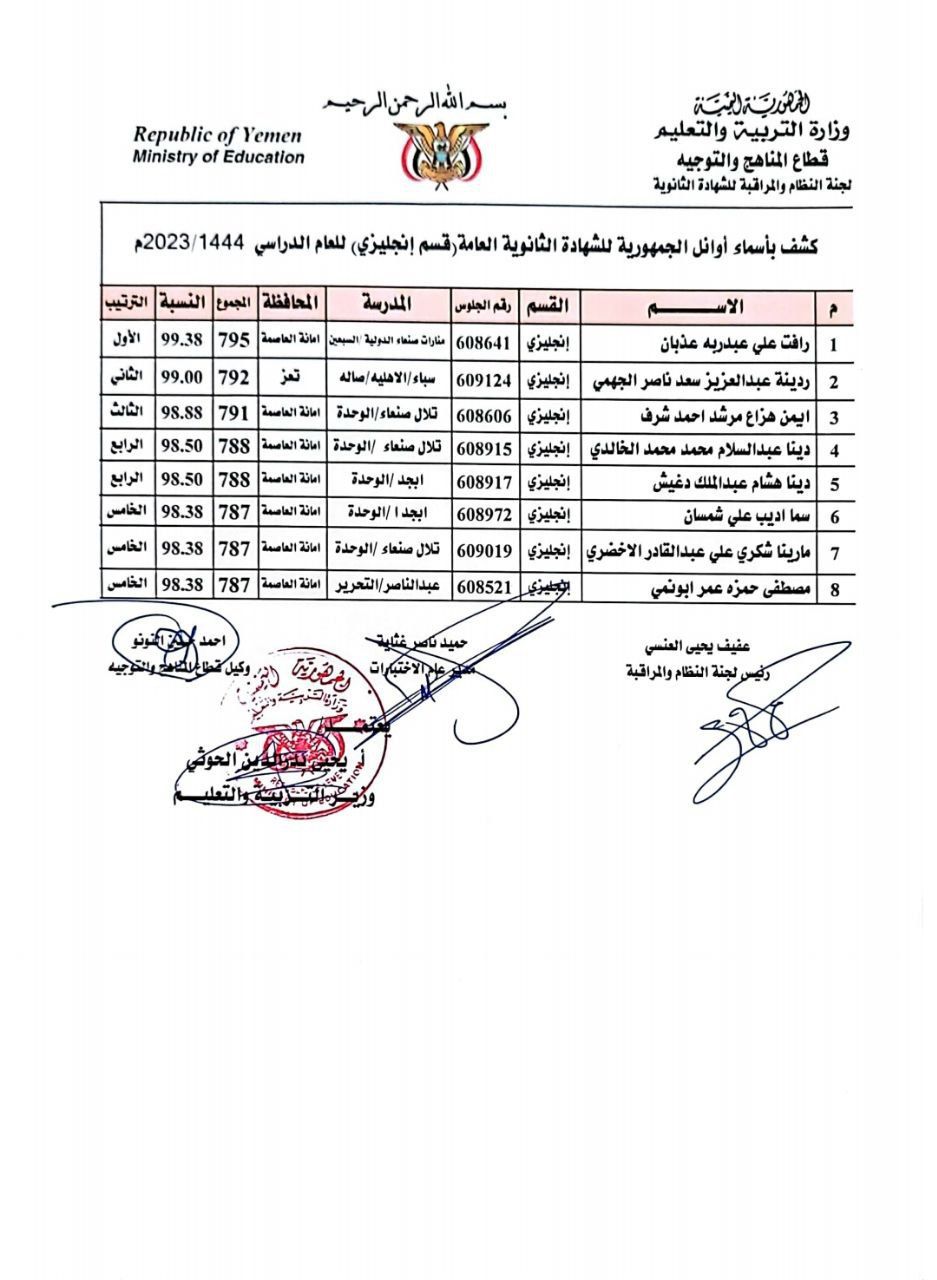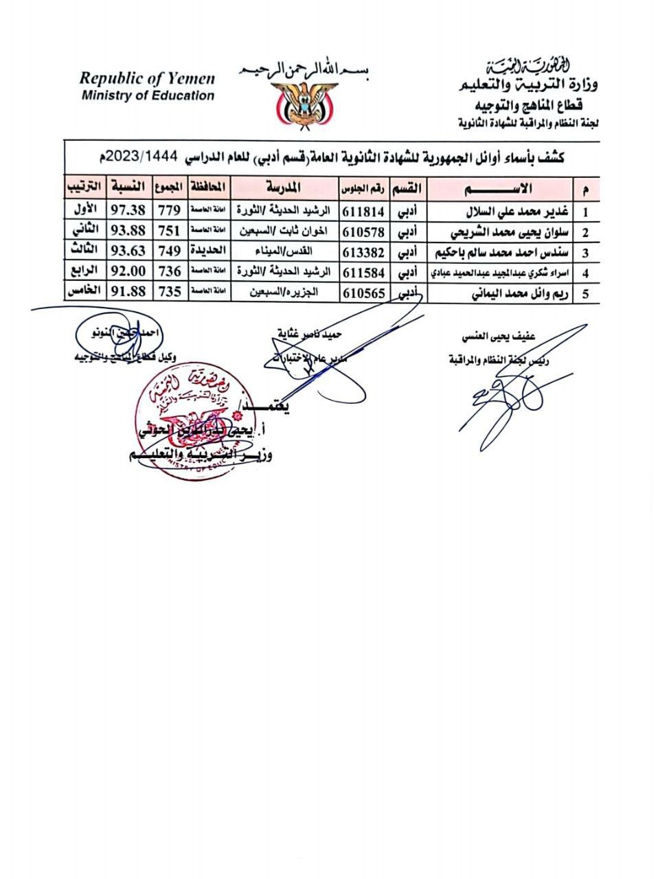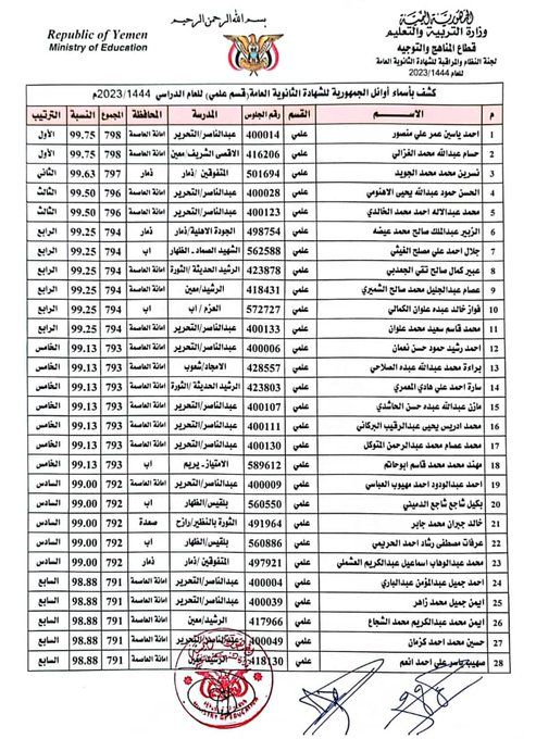 تربية صنعاء تنشُرُ أسماءَ أوائل الثانوية العامة