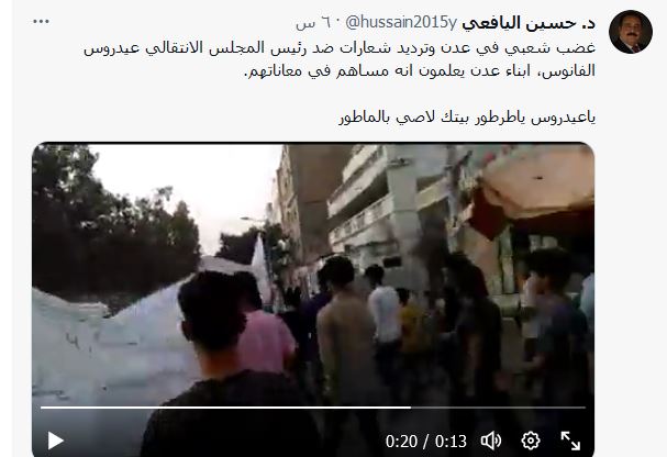 واظهرت مقاطع فيديو تداولها ناشطين على مواقع التواصل الاجتماعي  العشرات من سكان المدينة وهم يتظاهرون بالقرب من مقر اقامة  الزبيدي  ويهتفون بشعارات مناهضة له.