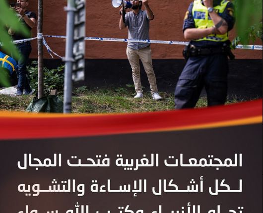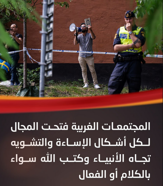 وقال قائد حركة انصار الله عبدالملك الحوثي  في كلمة له  بان المجتمع الغربية فتحت  المجال لكل أنواع الإساءة  والتشويه تجاه الأنبياء  وكتب الله سواء بالكلام او بالفعل.