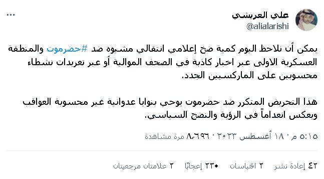 وقال الكاتب السياسي السعودي علي العريشي في تدوينة على ( تويتر) رصدها محرر (البوابة الإخبارية اليمنية ) : “يمكن أن نلاحظ اليوم كمية ضخ إعلامي انتقالي مشبوه ضد حضرموت والمنطقة العسكرية الاولى عبر اخبار كاذبة في الصحف الموالية أو عبر تغريدات نشطاء محسوبين على الماركسيين الجدد “.