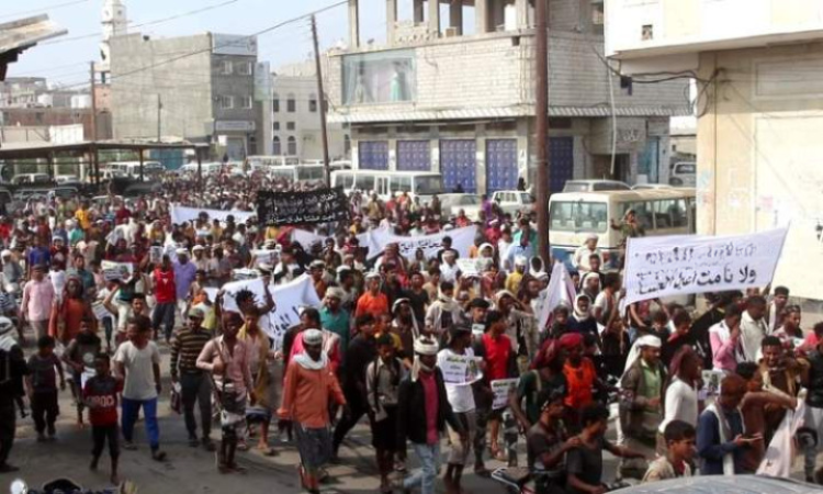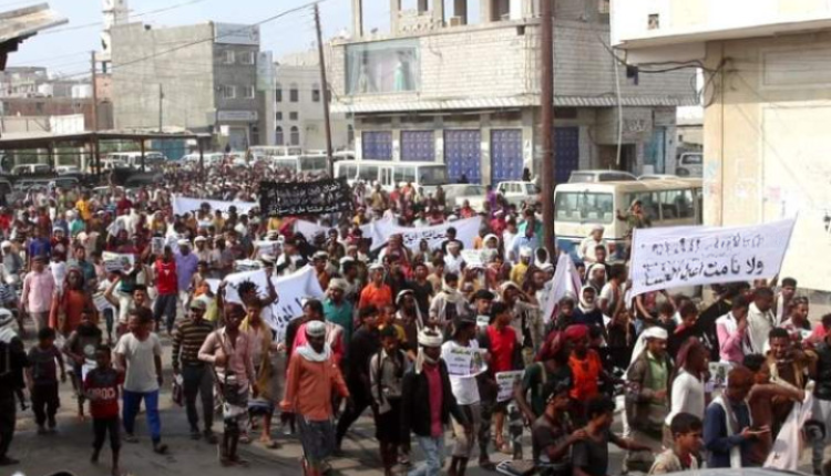 وحمّل المحتجون، حكومة معين ومجلسها الرئاسي، مسؤولية الانهيار الاقتصادي والمعيشي، متهمين ما وصفوها بأدوات التحالف بسرقة عائدات الثروات اليمنية وتسخيرها لصالحهم الخاص بينما يتضور الناس جوعاً.