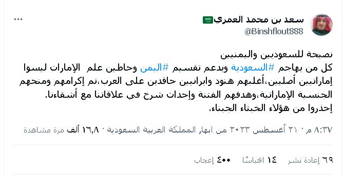 وقال الكاتب السياسي السعودي المقرب من الاستخبارات السعودية سعد العمري في تدوينة على (تويتر) : “كل من يهاجم السعودية ويدعم تقسيم اليمن وحاطين علم الإمارات ليسوا إماراتيين أصليين، أغلبهم هنود وايرانيين حاقدين على العرب “.