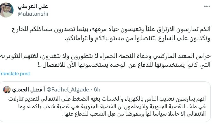 وكان العريشي وغيره من الناشطين السعوديين اتهموا الانتقالي بالعمالة والارتزاق لمصلحة الإمارات على حساب مصلحة المواطنين وقال:” انكم تمارسون الارتزاق علناً وتعيشون حياة مرفهة، بينما تصدرون مشاكلكم للخارج وتكذبون على الشارع لتتنصلوا من مسئولياتكم والتزاماتكم.. حراس المعبد الماركسي ودعاة النجمة الحمراء لا يتطورون ولا يتغيرون، لغتهم التثويرية التي كانوا يستخدمونها للدفاع عن الوحدة يستخدمونها الآن للانفصال .!