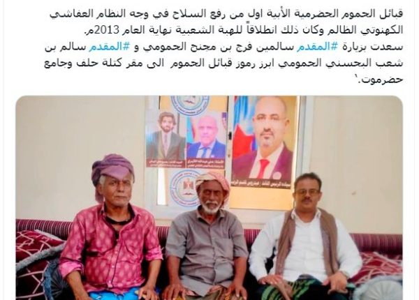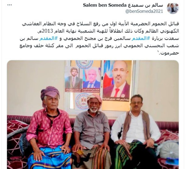 ونشر سالم بن سميدع رئيس كتلة وحلف حضرموت التي شكلها الانتقالي كقوة موازية للقوى الحضرمية المناهضة له صورة تجمعه بعددا من مشايخ قبائل الحموم التي ينتمي اليها نائب رئيس الانتقالي، فرج البحسني.
