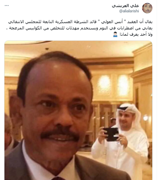 وكتب علي العريشي، الصحفي السعودي المحسوب على الاستخبارات،  بأن انيس العولي قائد الشرطة العسكرية للانتقالي  يعاني من ارق ، مرفقا صورة للمحافظ السابق جعفر محمد سعد في إشارة إلى وقوفه وراء الجريمة.
