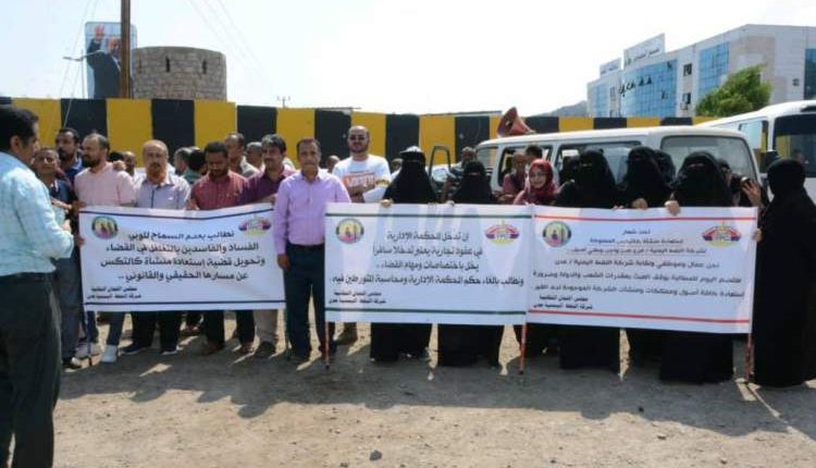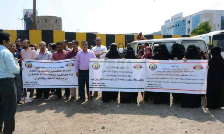نظم منتسبو شركة النفط  في مدينة عدن، جنوبي اليمن، الخميس، وقفة احتجاجية تنديداً بتحويل مرتباتهم إلى البنوك الخاصة.