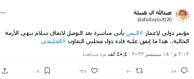 وأَكَّـــدَ مساعدُ رئيس تحرير صحيفة (عكاظ) السعوديّة المقرَّبة من البلاط الملكي عبدالله آل هتيلة في تدوينة على (إكس)، أن “قادةَ دول مجلس التعاون الخليجي اتفقوا على مؤتمر دولي لإعمار اليمن“.