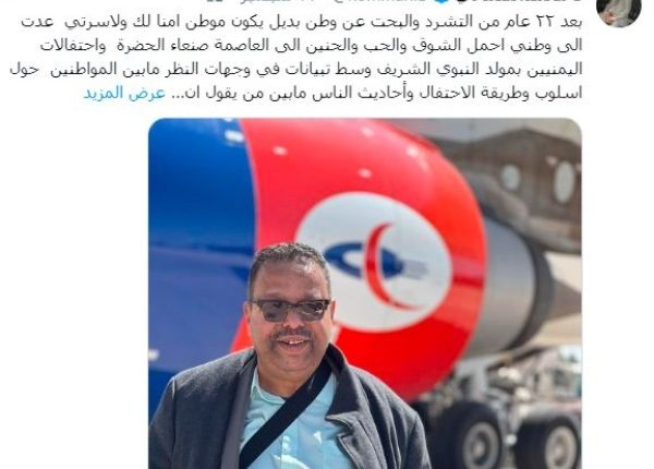 وكتب النعماني الذي ظهر مرتديا العلم اليمني في وسط صنعاء تغريدة مطولة على صفحته الرسمية بمواقع التواصل الاجتماعي  اعتبر فيها عودته الأولى منذ نحو 22 عاما.