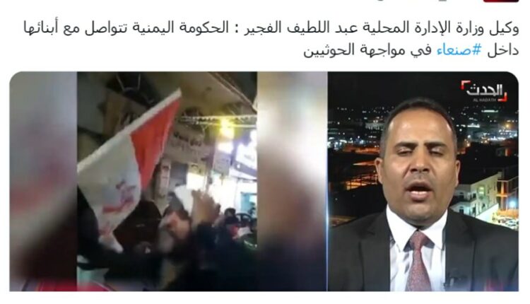 واعترف وكيل وزارة الإدارة المحلية في حكومة التحالف، عبداللطيف الفجير، في مقابلة له على قناة “الحدث” السعودية، بأن من أسماها “الحكومة اليمنية” على تواصل بأبنائها داخل اليمن في مناطق سيطرة حكومة صنعاء.