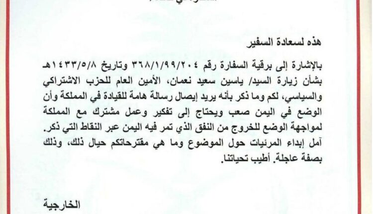 وجاء في الوثيقة المعنونة بـ”سرية للغاية وعاجلة جدًا”، والتي وجهتها الخارجية السعودية للسفير السعودي لدى اليمن، في أبريل عام 2012، ردًا على برقية السفارة للخارجية عن زيارة ياسين سعيد نعمان للسفير “لإيصال رسالة هامة للقيادة في المملكة”.