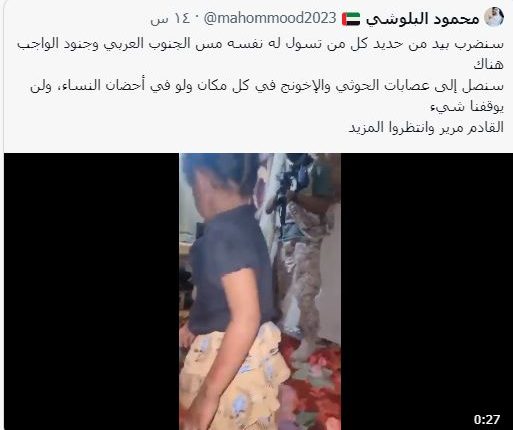 وقال محمود البلوشي، أحد ابرز ضباط الاستخبارات الإماراتية وناشطيها على مواقع التواصل الاجتماعي، ان بلاده ستضرب بيد من حديد ضد كل من تسؤل له نفسه مس جنود الواجب هناك ، متوعدة بملاحقتهم ولو كانوا في أحضان النساء.