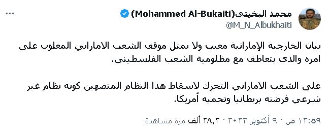 وقال عضو المكتب السياسي لحركة ( انصار الله ) محمد البخيتي في تدوينة على ( اكس): ” بيانُ الخارجية الإماراتية معيب ولا يمثل موقف الشعب الاماراتي المغلوب على امره والذي يتعاطف مع مظلومية الشعب الفلسطيني “.