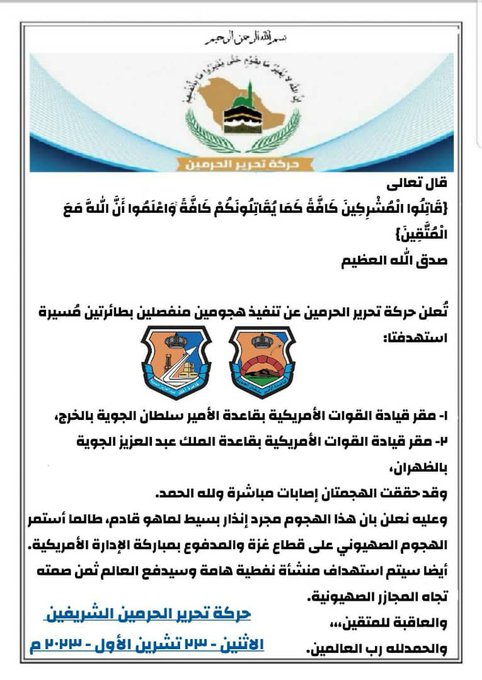 وتداول نشطاء بمواقع التواصل الاجتماعي بياناً لما أعلنته حركة مقاومة سعودية، تطلق على نفسها حركة تحرير الحرمين، تبنيها استهداف مقر قيادة القوات الأمريكية في كلاً من قاعدة الأمير سلطان الجوية في منطقة الخرج وقاعدة الملك عبدالعزيز الجوية في منطقة الظهران مساء الإثنين.